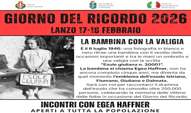 C’è una fotografia che ha attraversato la storia e non ha mai smesso di parlare. Una bambina in piedi, una valigia tra le mani, un cartello al collo: Esule giuliana n. 30001. Da quell’immagine, scattata nel 1946 a Pola, prende forma il “Giorno del Ricordo”: per l’occasione, la Città di Lanzo Torinese accoglierà Egea Haffner, la “bambina con la valigia”, divenuta simbolo di una tragedia che ha coinvolto oltre 250mila persone costrette ad abbandonare la propria terra. ?