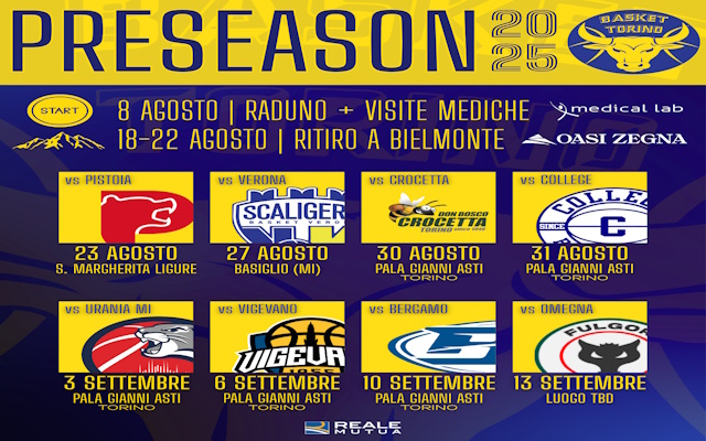 Un test che ha visto i gialloblù più affaticati e con meno lucidità rispetto alle precedenti uscite di precampionato, di fronte a una squadra che ha mostrato una buona organizzazione e un buon livello di fisicità nonostante la categoria di differenza. Dopo una preseason tutto sommato positiva, Torino ora non deve lasciare che lo stop all’ultima amichevole influisca negativamente sul morale, con l’obiettivo di ricaricare le batterie e prepararsi al meglio nella settimana di allenamenti che precede l’esordio in campionato con Cividale (domenica 21 settembre alle 18 al Pala Gianni Asti).